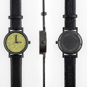フォレストの芝生シリーズの最新作「Metal Black Forrest」です。天然の苔を特殊加工して作った文字盤の鮮やかな緑とメタルブラックのケースが特徴のこのモデルはフォーマルからアウトドアまで、幅広いシチュエーションに対応しております。